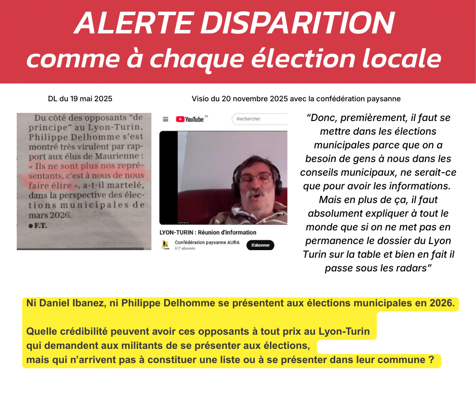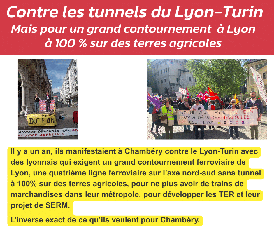 Leurs seconds soutiens sont des élus de Lyon et Paris qui veulent récupérer les financements du Lyon-Turin pour un grand contournement ferroviaire de Lyon et pour la LGV Paris Normandie, eux pas en tunnel et exclusivement sur des terres agricoles.