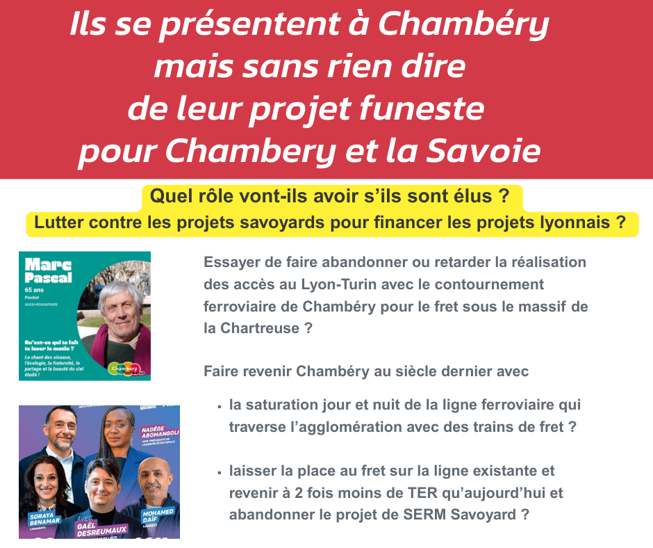 Son abandon serait mortifère pour Chambéry avec la saturation jour et nuit de la ligne existante avec des trains de marchandises au mépris de milliers de riverains immédiats, des usagers du TER et du projet de SERM.
