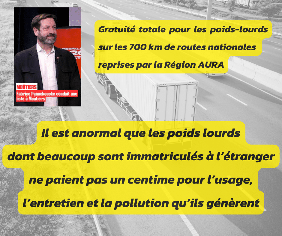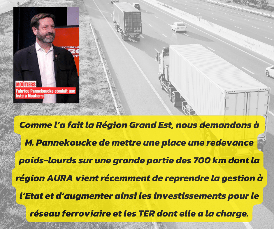 Comme la Région Grand Est nous demandons à M. Pannekoucke de mettre une place une redevance poids-lourds sur une grande partie des 700 km dont la région AURA vient récemment de reprendre la gestion à l’Etat et d’augmenter ainsi les investissements pour le réseau ferroviaire et les TER dont elle a la charge.