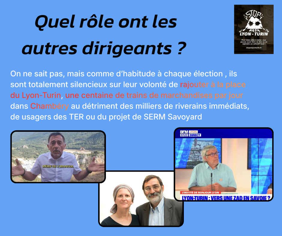 On ne sait pas, mais comme d’habitude à chaque élection , ils sont totalement silencieux sur leur volonté de rajouter à la place du Lyon-Turin, une centaine de trains de marchandises par jour dans Chambéry au détriment des milliers de riverains immédiats, de usagers des TER ou du projet de SERM Savoyard.